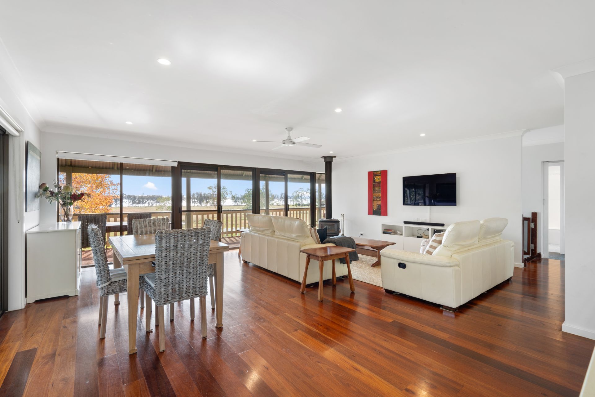 • Open-plan living with timber floors and combustion fireplace