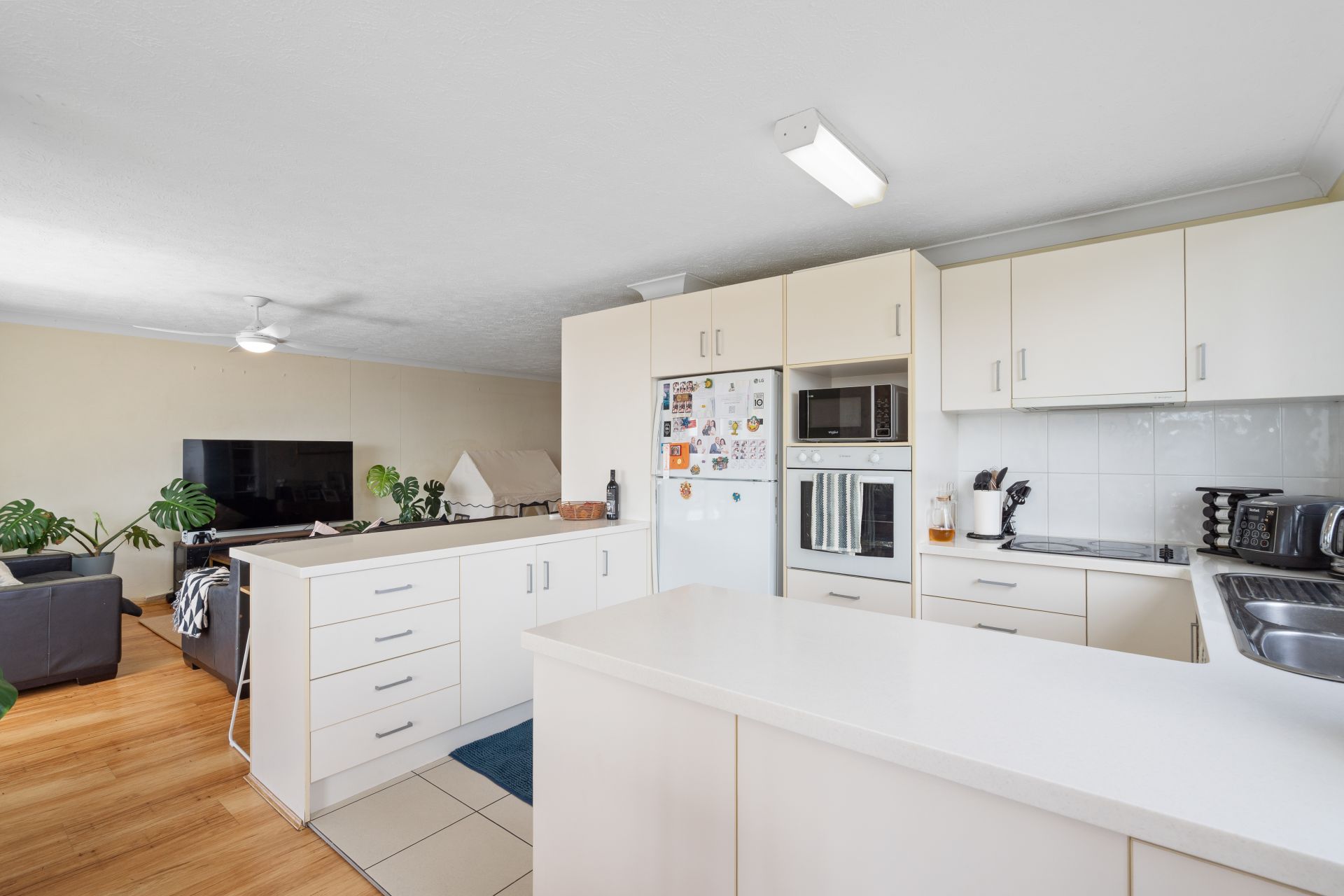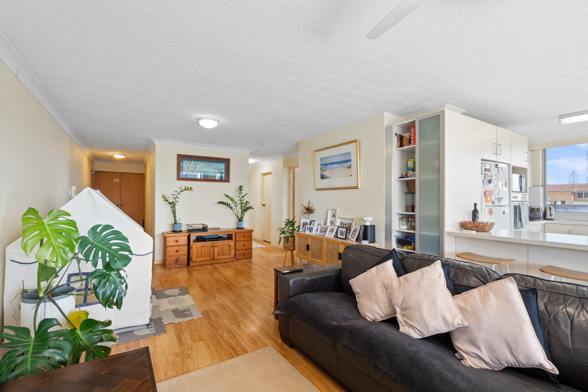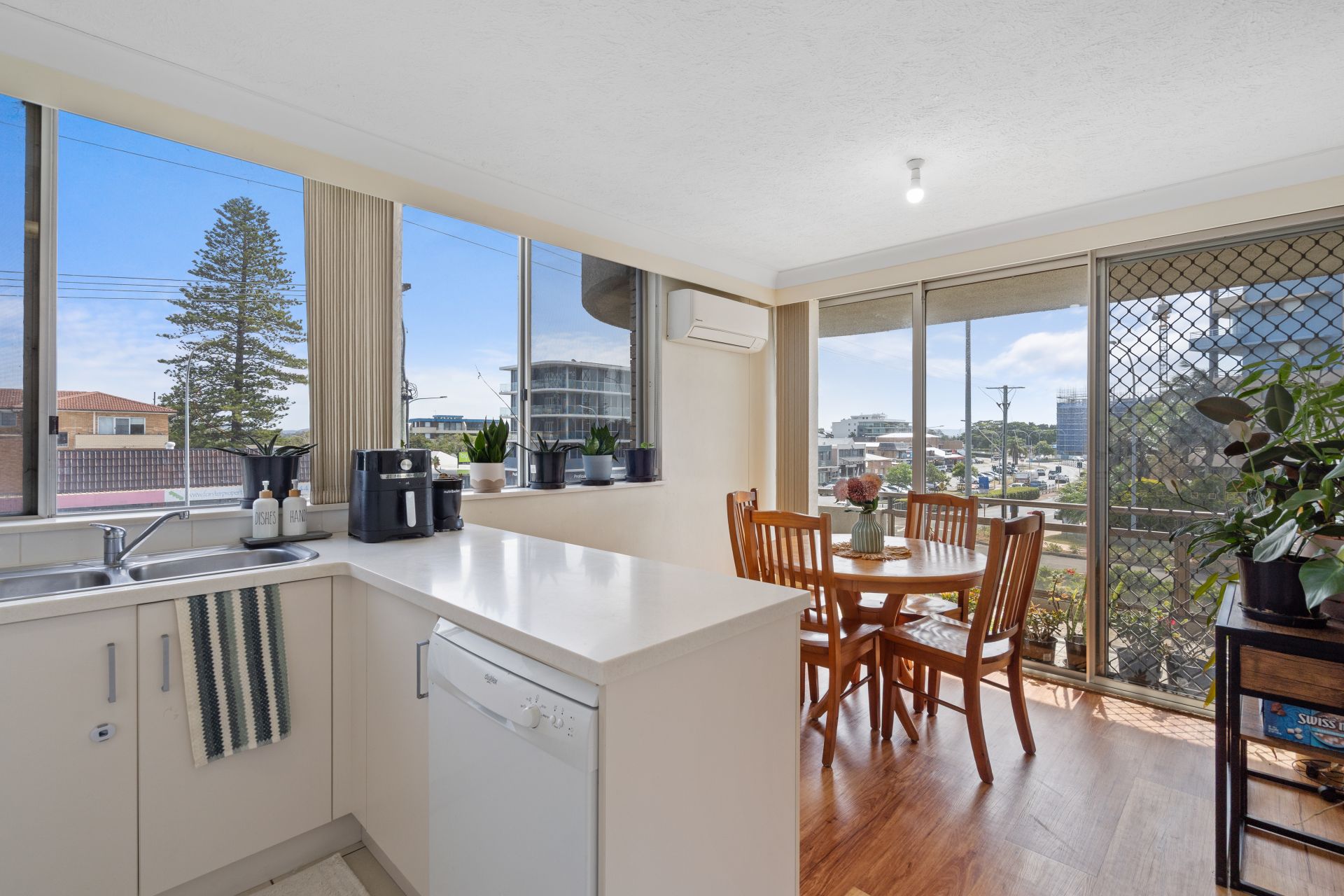 Stepping inside, the light-filled living and dining zone opens directly onto a large balcony, creating an easy indoor–outdoor flow ideal for morning coffees, afternoon breezes or watching the buzz of Forster unfold below. The open-plan kitchen offers plenty of bench space, excellent storage, breakfast bar seating and wide windows inviting in natural light.
