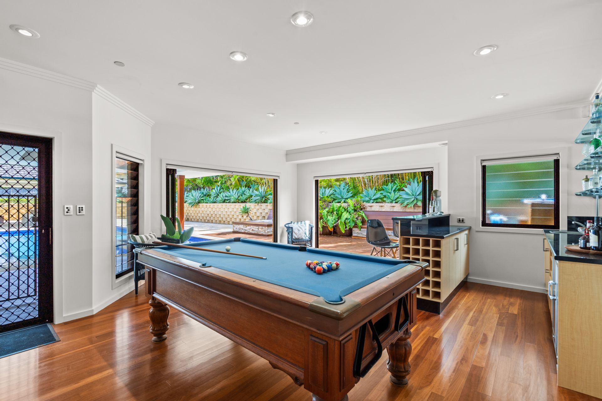 • Pool house featuring a built-in bar, billiards area, and bi-fold doors that blur the line between inside and out