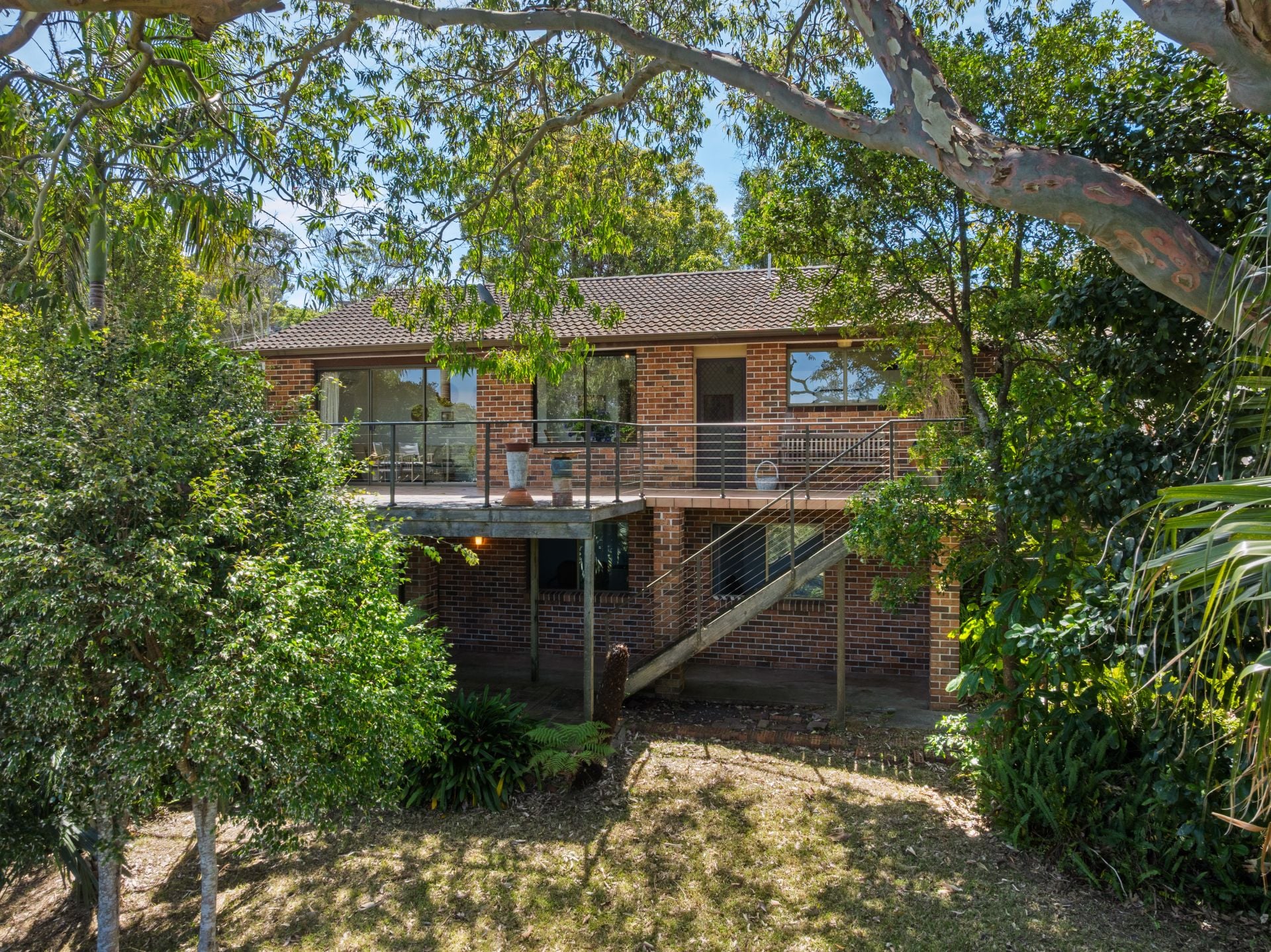 Downstairs, a spacious self-contained one-bedroom flat offers excellent flexibility - ideal for multi-generational living, guest accommodation, a teen retreat, workspace, or future rental income. An additional under-house patio area provides a shaded outdoor zone surrounded by lush ferns, palms and native plantings, overlooking and opening onto the Reserve.