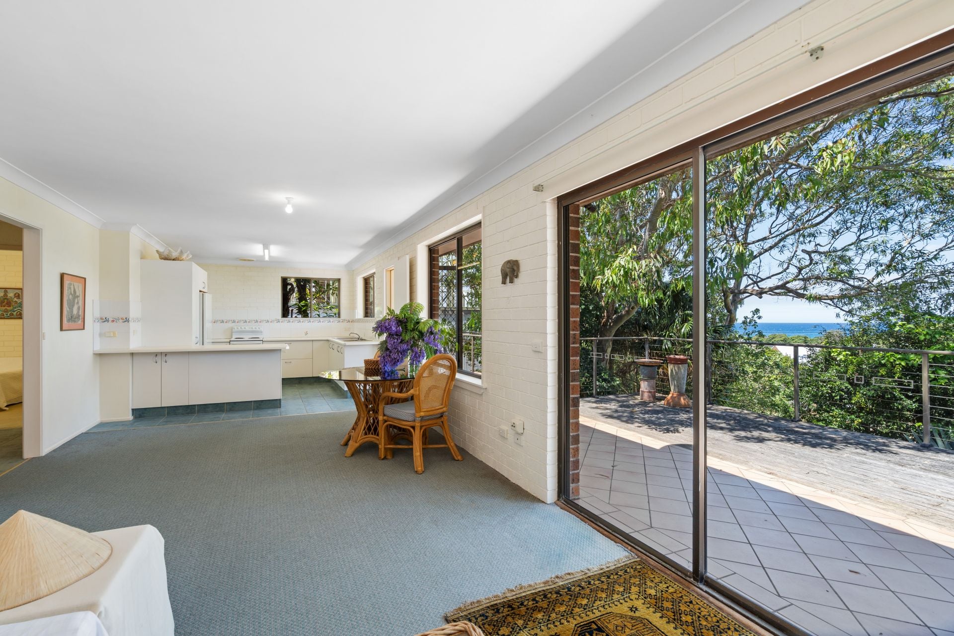 From the kitchen, dining and living areas - and expansive deck - you can take in ocean views across the treetops all the way to Cape Hawke Headland. From here, mornings begin with golden sunrises, evenings reveal soft moonrises, and clear night skies put on a dazzling star-filled display. Throughout winter, you can watch the annual whale migration pass by. The home is naturally cool in summer thanks to the prevailing north-easterly breeze drifting up from the ocean.