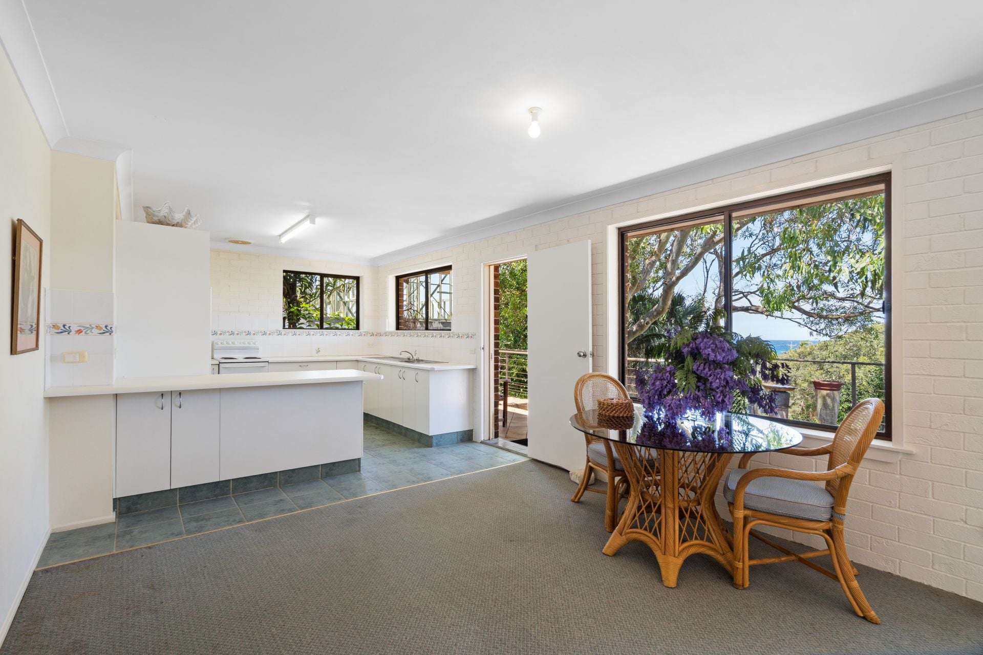 Warm, inviting, and full of potential, the upper level enjoys a generous open-plan living, dining and kitchen zone framed by leafy outlooks and coastline views. Large windows connect the indoors with established gardens, while sliding doors open onto a wide deck - the perfect place for morning coffee, weekend entertaining, or soaking in the backdrop of swaying palms and sea breezes.