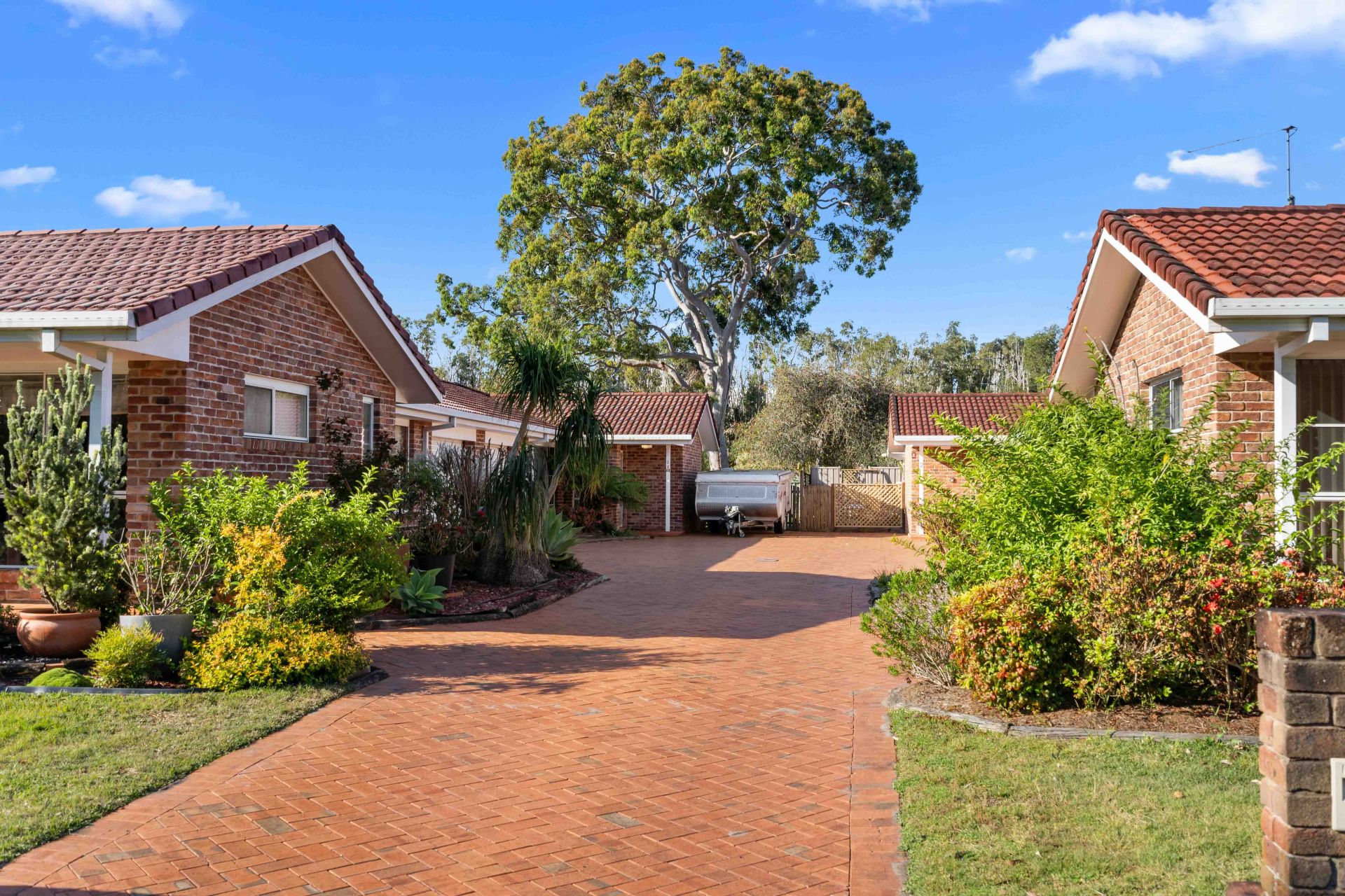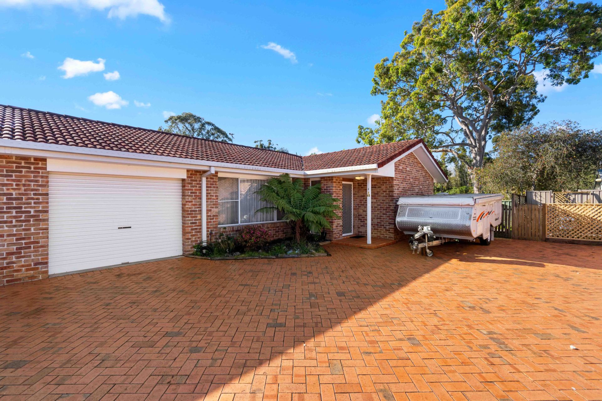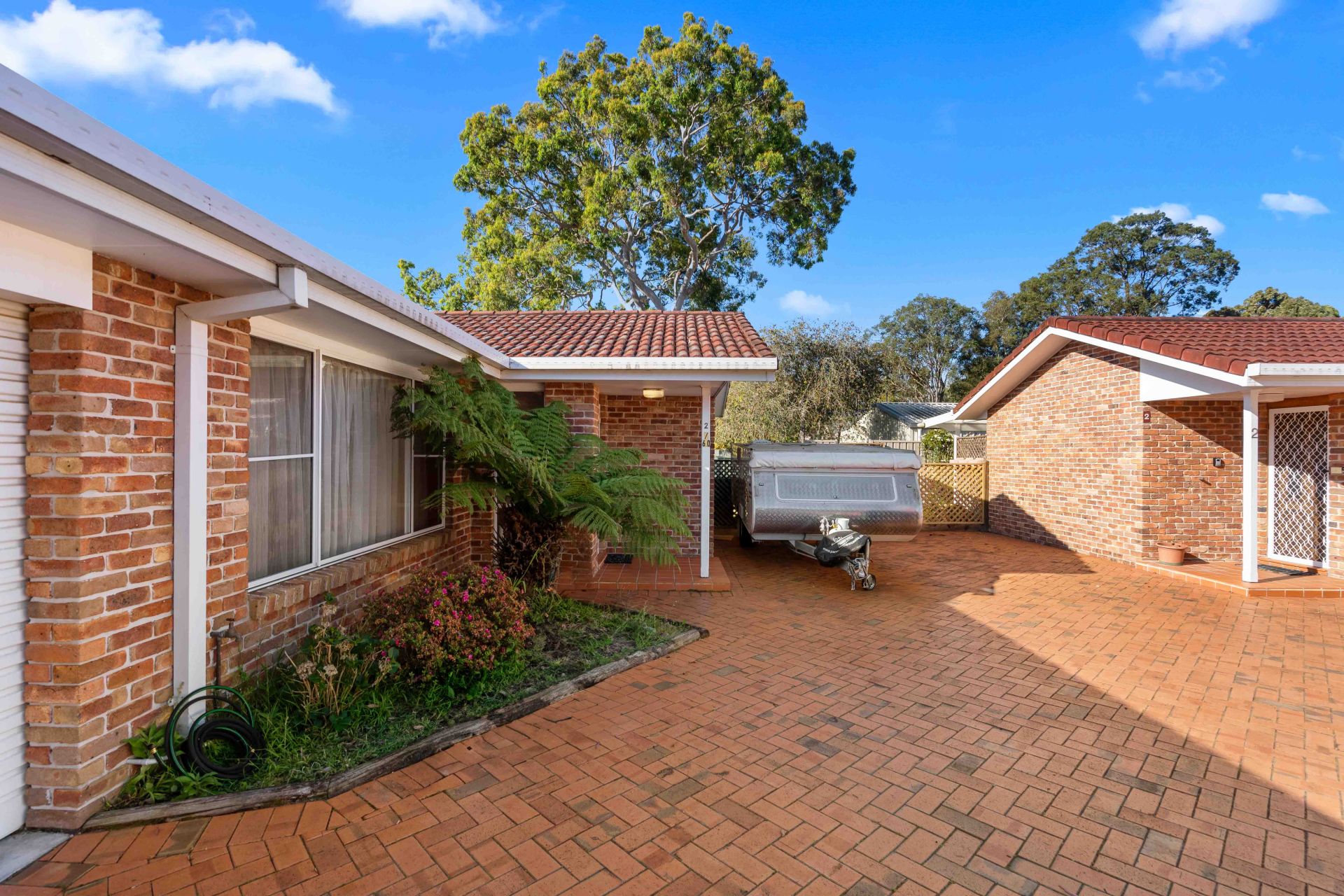Nestled at the back of a duplex-style complex, the home features a long driveway providing extra parking alongside a secure lock-up garage. The exposed brick exterior and tiled roof create a warm, welcoming vibe, setting the tone for what awaits inside.