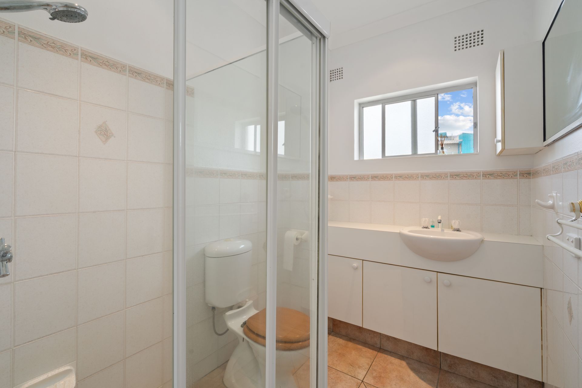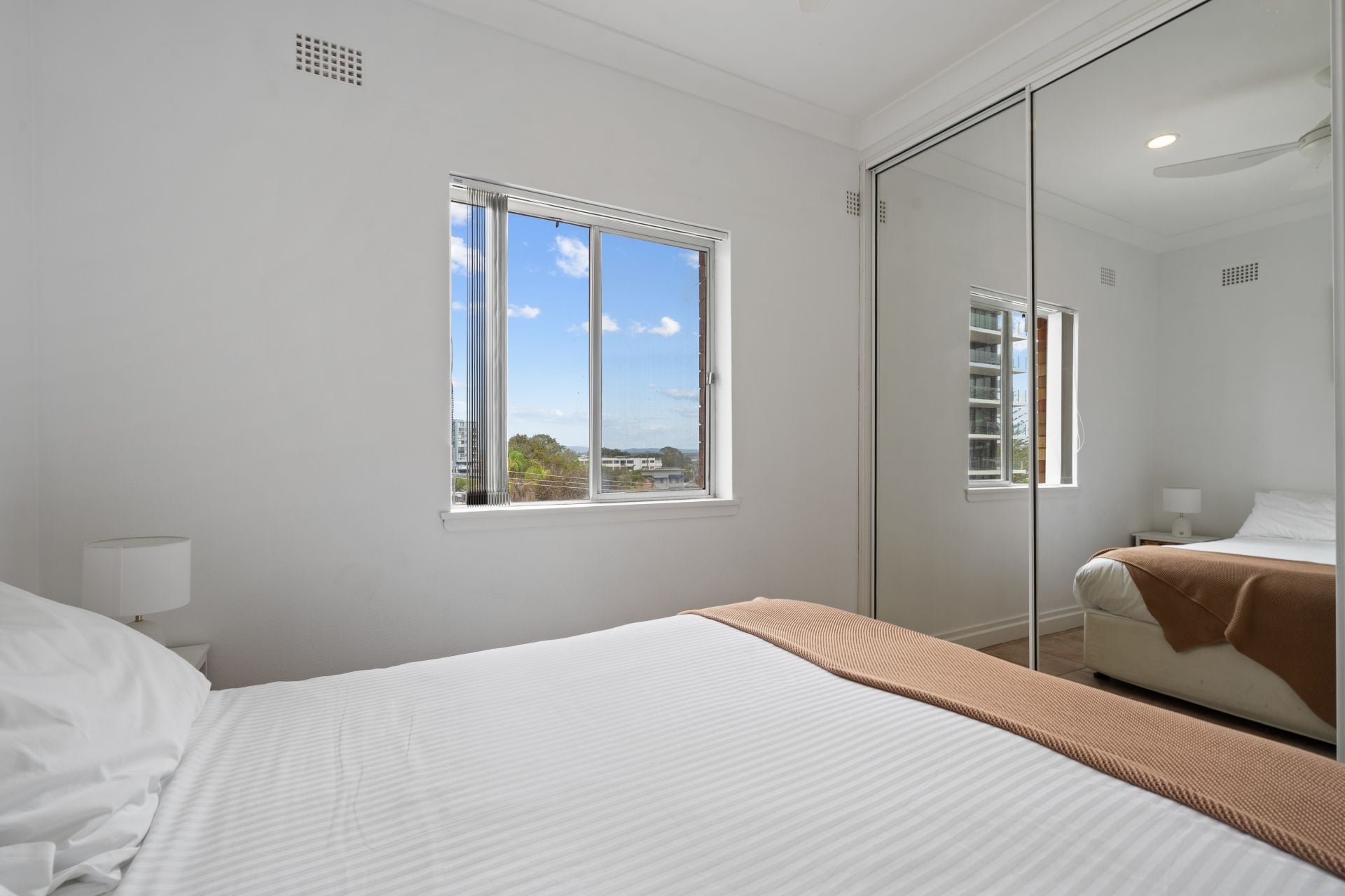 Both bedrooms are generously sized and include built-in wardrobes, with the main bedroom featuring mirrored robes and a calm, light-filled feel. The bathroom is centrally located and includes a shower, vanity and toilet.
