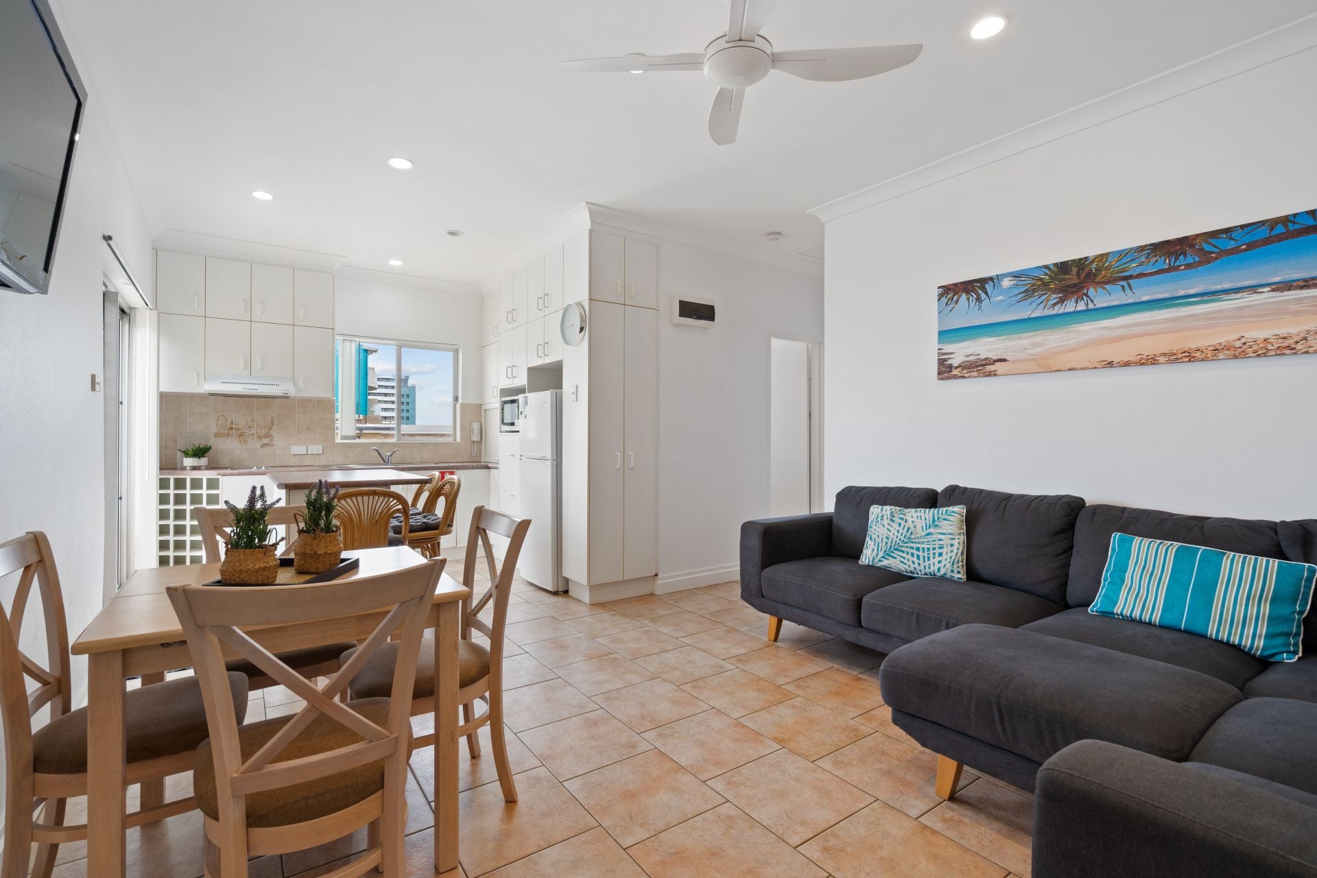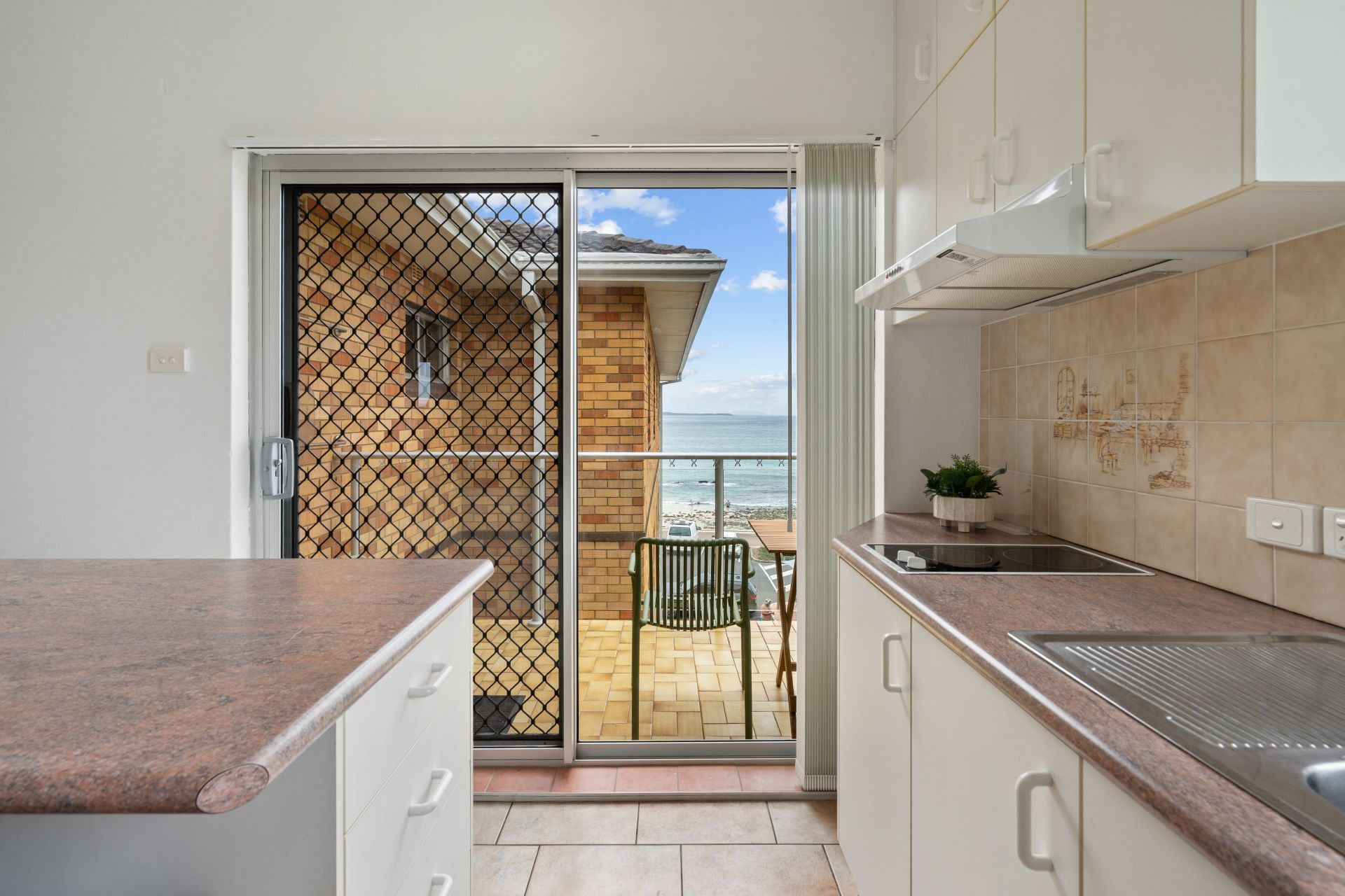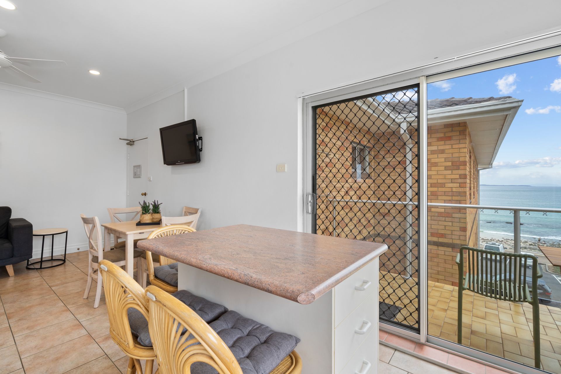 The kitchen is neatly appointed with excellent storage, breakfast bar seating and direct access to the balcony, making it practical for both everyday living and holiday use. The adjoining living and dining zone is comfortable and inviting, ideal for relaxing after a day at the beach.