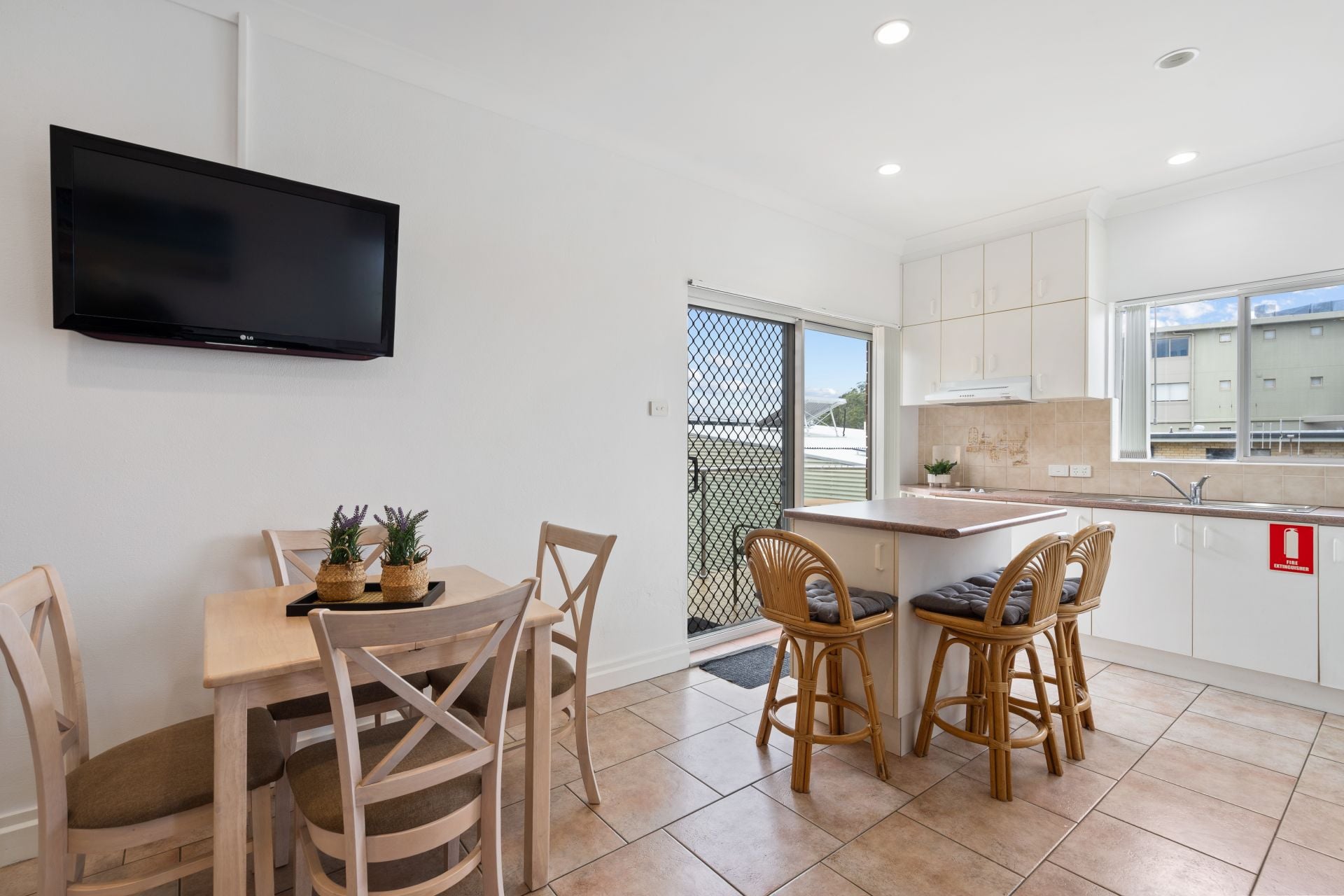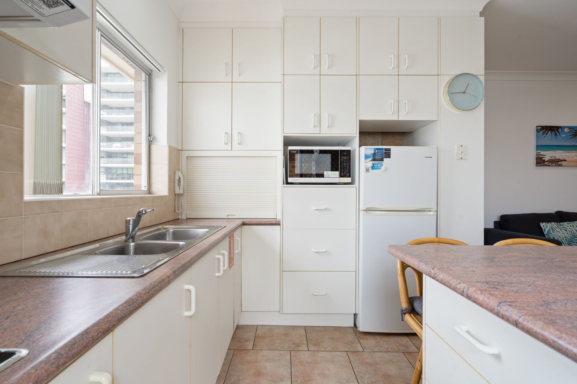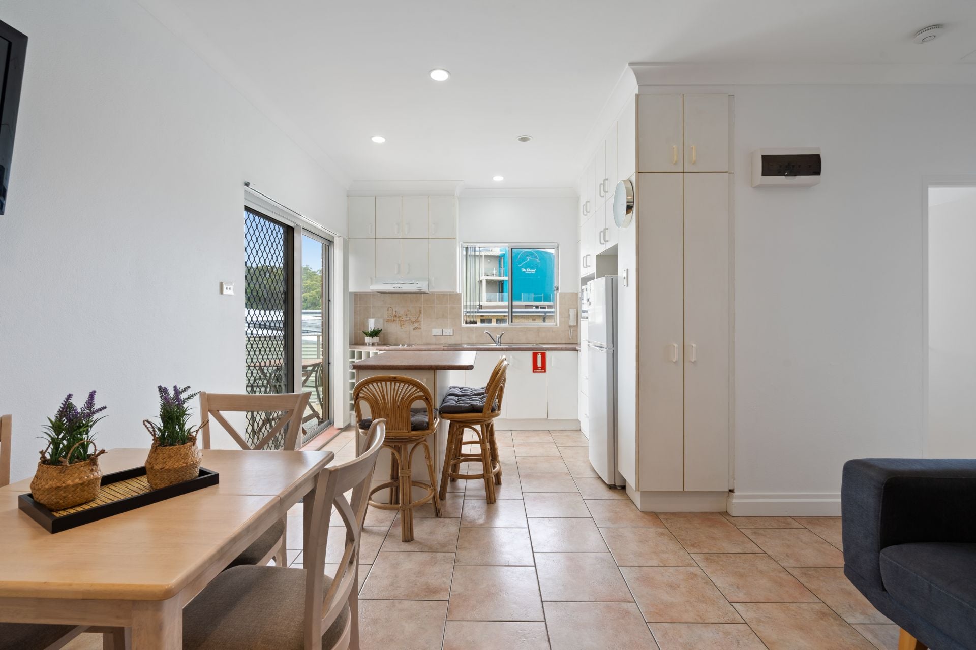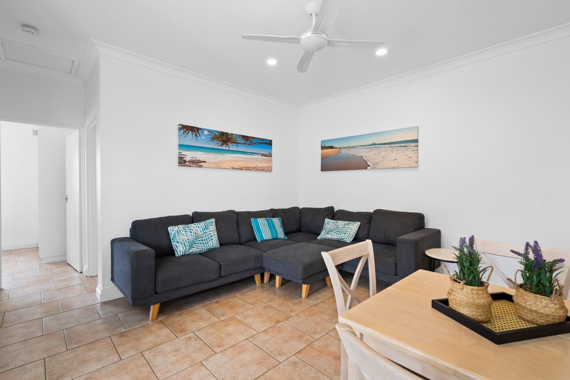 The kitchen is neatly appointed with excellent storage, breakfast bar seating and direct access to the balcony, making it practical for both everyday living and holiday use. The adjoining living and dining zone is comfortable and inviting, ideal for relaxing after a day at the beach.